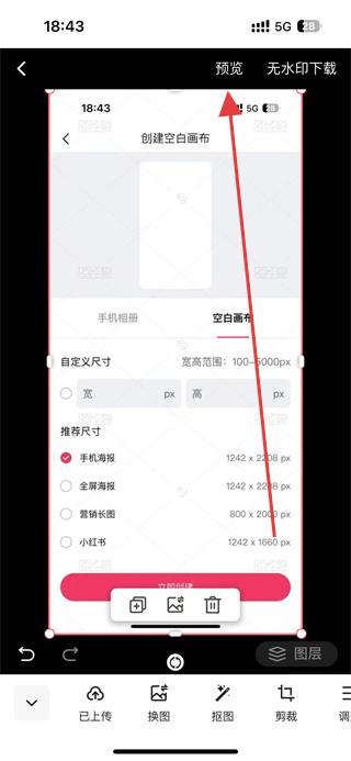 4、在畫布編輯頁面,可進(jìn)行摳圖、剪裁、調(diào)色等操作,編輯完成后點(diǎn)擊預(yù)覽按鈕查看效果,也可選擇無水印下載,獲取設(shè)計(jì)好的作品。