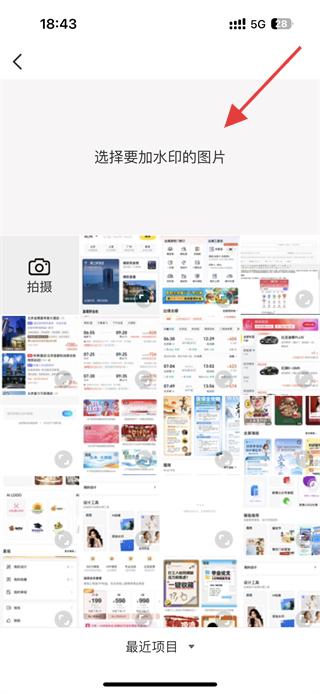 3、進(jìn)入添加水印板塊,選擇要加水印的圖片,可從手機(jī)相冊或最近項(xiàng)目中選擇,以便為圖片添加專屬水印。