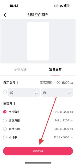 1、進(jìn)入創(chuàng)建空白畫布板塊,選擇推薦尺寸如手機(jī)海報(bào),或自定義尺寸,點(diǎn)擊立即創(chuàng)建按鈕,創(chuàng)建空白畫布用于設(shè)計(jì)。