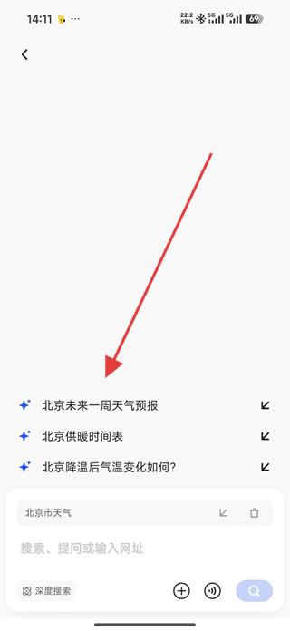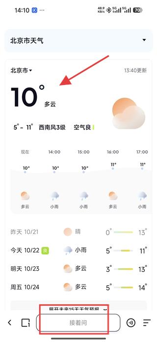 4、查看完天氣信息后,可點(diǎn)擊接著問按鈕,繼續(xù)詢問北京供暖時間表、北京降溫后氣溫變化如何等相關(guān)問題,獲取更多天氣資訊。