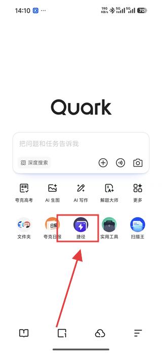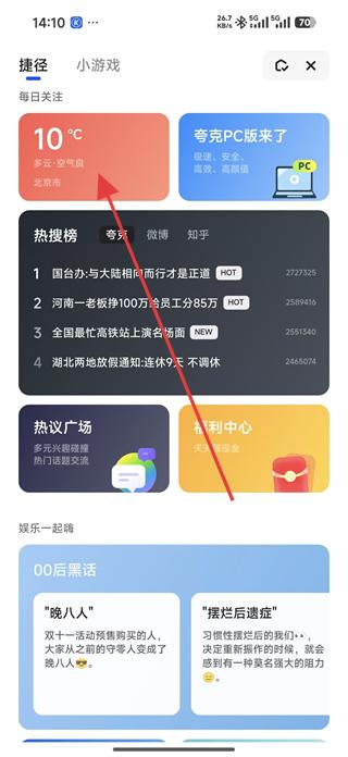 1、打開夸克軟件,在主界面找到捷徑選項(xiàng),點(diǎn)擊進(jìn)入后可看到每日關(guān)注板塊,其中有顯示北京天氣的入口,點(diǎn)擊即可查看北京市當(dāng)前天氣信息。
