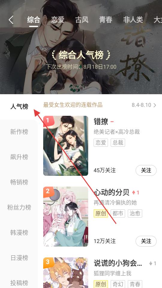 2、切換至綜合人氣榜頁(yè)面,查看人氣榜作品,點(diǎn)擊感興趣的漫畫(huà),進(jìn)入作品詳情頁(yè),了解作品信息。