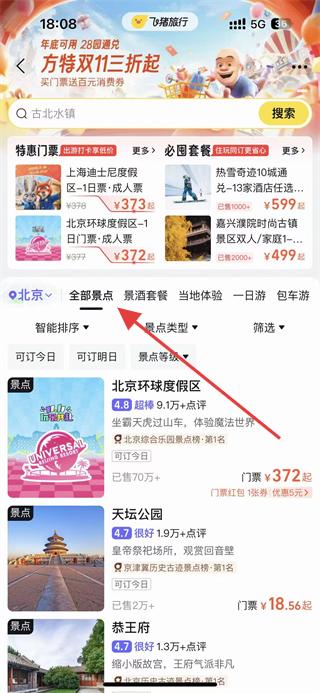 2、進(jìn)入景點(diǎn)套餐板塊可查看北京的全部景點(diǎn)、景點(diǎn)套餐等分類,如北京環(huán)球度假區(qū)、天壇公園等,選擇心儀的景點(diǎn)套餐,了解門票價(jià)格和預(yù)訂信息。