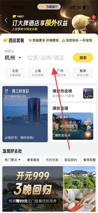 3、進(jìn)入酒店套餐板塊可選擇目的地如杭州,搜索位置、品牌或酒店,查看爆款熱賣榜、爆款直播等板塊的酒店套餐,選擇合適的酒店套餐預(yù)訂。