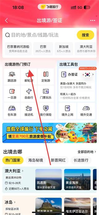 4、進(jìn)入出境游,簽證板塊可查看出境游熱門預(yù)訂分類,如跟團(tuán)游、郵輪游等,也可查看熱門國(guó)家的旅游推薦,選擇感興趣的出境游產(chǎn)品,辦理簽證或預(yù)訂行程。