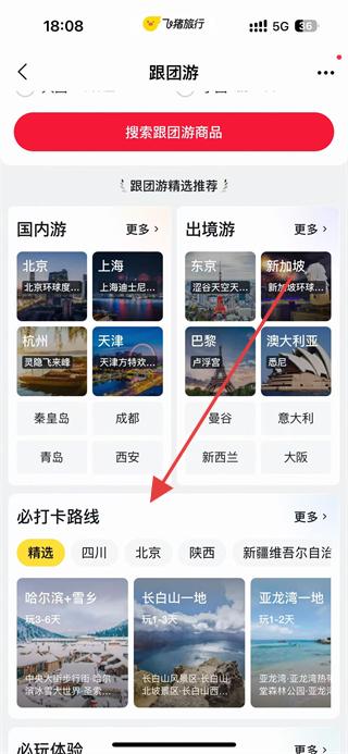 1、進(jìn)入跟團(tuán)游板塊,可瀏覽國(guó)內(nèi)游出境游的精選推薦目的地,如北京、東京等,也可查看必打卡路線,選擇感興趣的旅行路線。