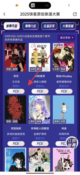 4、在參賽作品頁面,選擇喜歡的作品如雙咒,點擊PICK按鈕完成投票,后續(xù)可繼續(xù)為其他作品投票,參與大賽互動,支持原創(chuàng)漫畫創(chuàng)作。