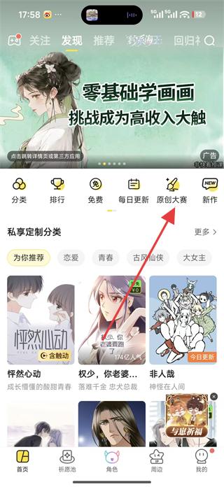 1、打開快看漫畫軟件,進(jìn)入首頁看到原創(chuàng)大賽的入口,點擊進(jìn)入2025快看原創(chuàng)條漫大賽頁面。