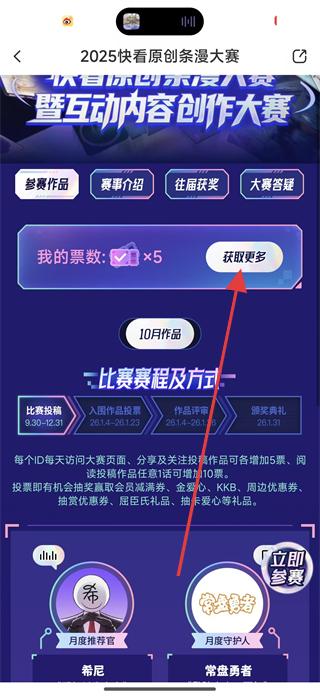 2、在大賽頁面,點擊獲取更多按鈕,進(jìn)入我的選票頁面,了解獲取選票的方式。