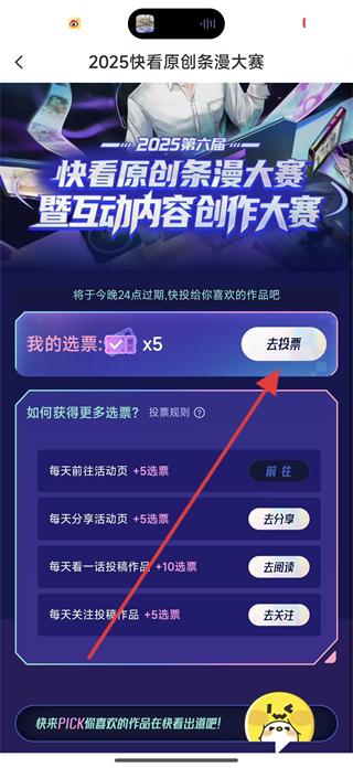 3、在我的選票頁面,點擊去投票按鈕,進(jìn)入?yún)①愖髌妨斜眄撁孢x擇喜歡的作品。