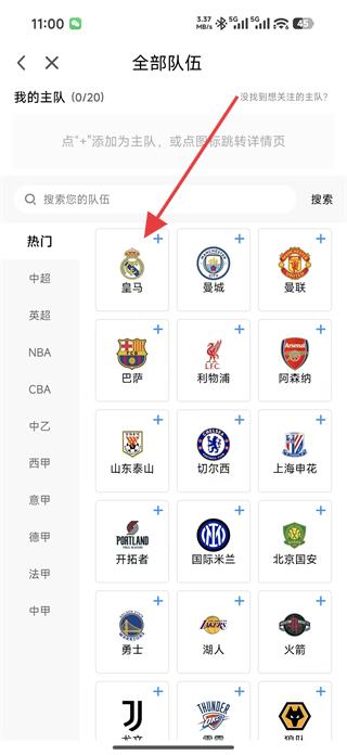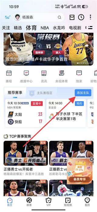 2、進(jìn)入體育板塊可看到各類賽事推薦如勇士VS開拓者等,點(diǎn)擊添加主隊(duì)按鈕,進(jìn)入全部隊(duì)伍頁面。