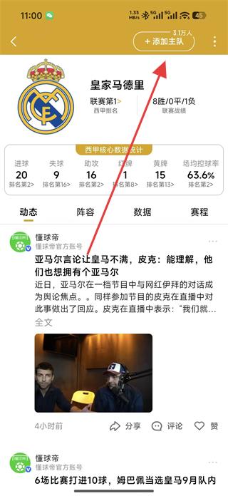 4、在皇馬詳情頁面可查看球隊(duì)的聯(lián)賽排名、戰(zhàn)績、進(jìn)球、失球等數(shù)據(jù),點(diǎn)擊添加主隊(duì)按鈕,將皇馬設(shè)為自己的主隊(duì)。