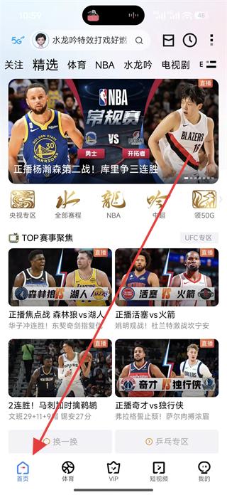 1、打開咪咕視頻app,在首頁我們可以切換到體育賽事頁面,進(jìn)入下一步的選擇。