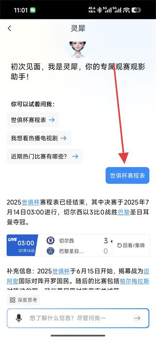 2、在靈犀助手頁面可詢問世界杯賽程表等信息,點(diǎn)擊世界杯賽程表選項(xiàng),查看2025世界杯的賽程和決賽結(jié)果。