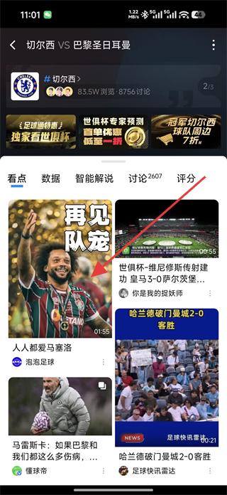 3、進(jìn)入切爾西VS巴黎圣日耳曼的比賽頁面,可瀏覽看點(diǎn)、數(shù)據(jù)、智能解說等板塊,點(diǎn)擊感興趣的視頻如再見隊(duì)寵,進(jìn)入視頻播放頁面。