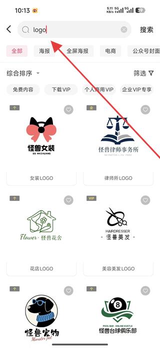 1、在搜索欄輸入logo,可看到全部、海報等分類的LOGO模板,如女裝LOGO、律師LOGO等,選擇心儀模板進入編輯頁面。