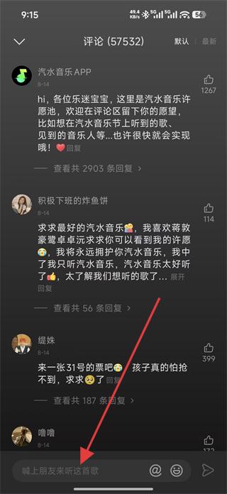 4、進入評論區(qū)可查看其他樂迷的許愿評論,也可在輸入框中留下自己的音樂愿望,參與互動,同時可邀請朋友來聽這首歌,擴大互動范圍,增加愿望實現(xiàn)的機會。