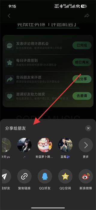 3、在分享頁面選擇分享渠道如微信好友、QQ好友等,將活動分享給朋友,完成任務(wù)獲取許愿機會。