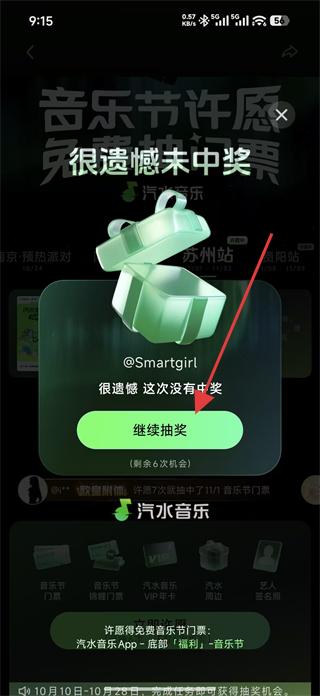 1、音樂節(jié)許愿抽獎活動,若未中獎點擊繼續(xù)抽獎按鈕,繼續(xù)參與抽獎,消耗剩余抽獎機會。