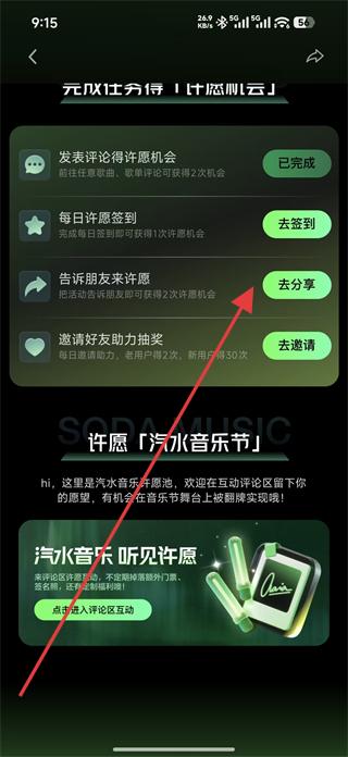 2、進入元以任務(wù)頁面可完成每日許愿簽到、告訴朋友來許愿等任務(wù)獲取許愿機會,點擊去分享按鈕,進入分享頁面。