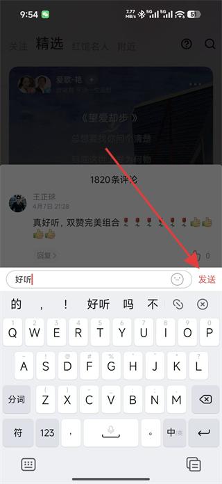 2、在輸入框中輸入評(píng)論內(nèi)容,如好聽點(diǎn)擊發(fā)送按鈕,完成評(píng)論發(fā)布,參與歌曲討論。