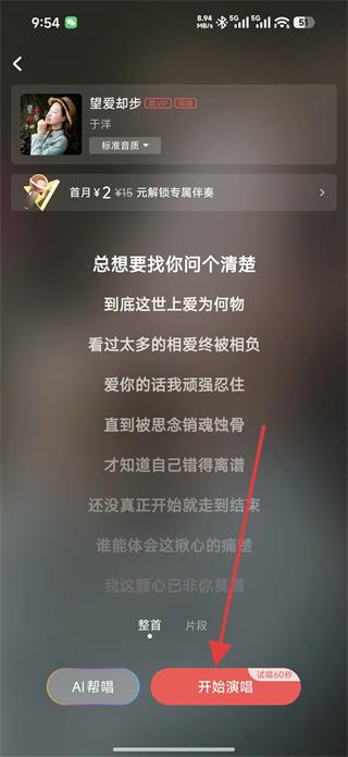 3、進(jìn)入歌曲K歌頁面,點(diǎn)擊開始演唱按鈕,進(jìn)入演唱準(zhǔn)備階段,可選擇整曲或片段演唱。
