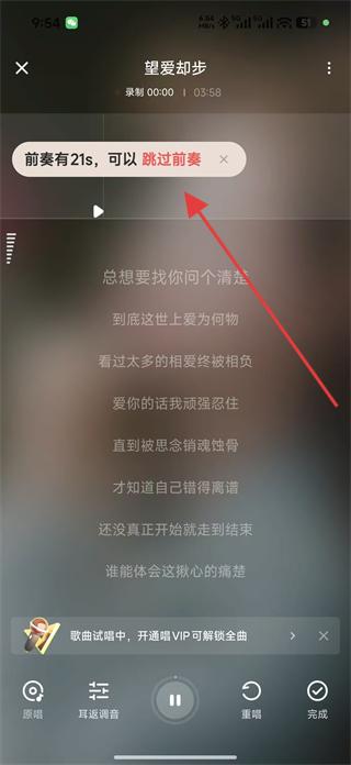 4、在演唱頁面可選擇跳過前奏,直接開始演唱,也可調(diào)整原唱、耳返調(diào)音等設(shè)置,享受K歌體驗(yàn),演唱完成后可查看評(píng)分,參與更多K歌活動(dòng)。