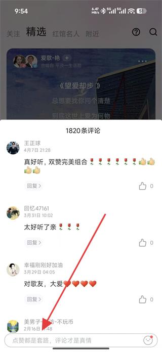 1、打開酷狗唱唱app,進(jìn)入精選板塊的評(píng)論區(qū),可瀏覽其他用戶對(duì)歌曲的評(píng)論,如對(duì)望愛卻步的夸贊,點(diǎn)擊輸入框,準(zhǔn)備發(fā)表自己的評(píng)論。