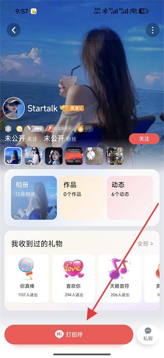 2、在名人主頁(yè)可查看其相冊(cè)、作品、動(dòng)態(tài)等信息,點(diǎn)擊打招呼按鈕,準(zhǔn)備與名人互動(dòng)。