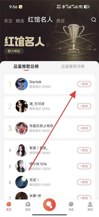 1、打開(kāi)酷狗唱唱app進(jìn)入紅館名人板塊,可看到品鑒推歌總榜和月榜,找到感興趣的名人如Startalk,點(diǎn)擊關(guān)注按鈕,進(jìn)入其主頁(yè)。
