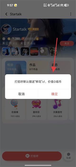 3、在打招呼確認(rèn)頁(yè)面,會(huì)提示打招呼默認(rèn)贈(zèng)送鮮花1朵,點(diǎn)擊確定按鈕完成打招呼操作,與名人建立互動(dòng)。