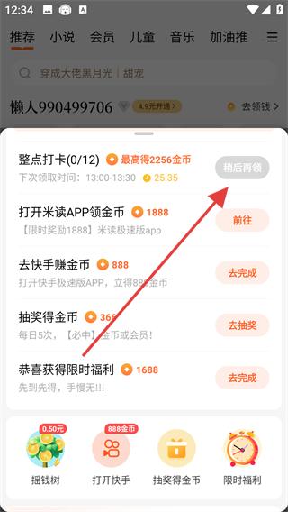 4、在福利頁(yè)面還有整點(diǎn)打卡、打開(kāi)米讀APP領(lǐng)金幣、去快手賺金幣等多種任務(wù),若暫時(shí)不想領(lǐng)取整點(diǎn)打卡福利可點(diǎn)擊稍后再領(lǐng)。