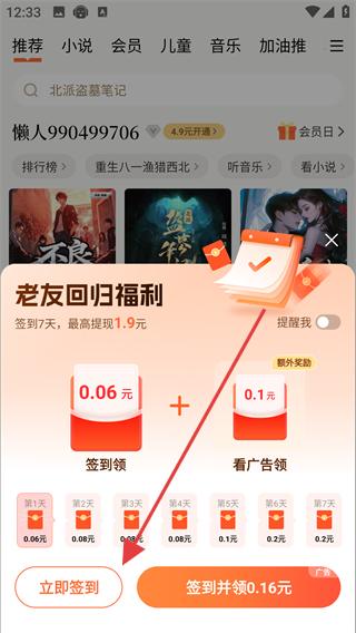 1、進(jìn)入推薦頁(yè)面,若有老友回歸福利彈窗,可選擇立即簽到或簽到并領(lǐng)0.16元,完成簽到領(lǐng)取福利。
