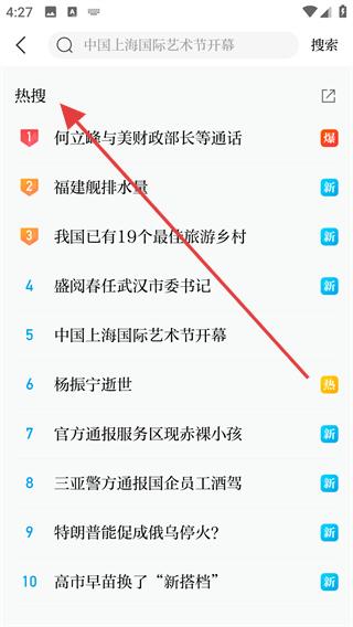 1、進(jìn)入搜索頁(yè)面在頁(yè)面中可看到熱搜榜單,選擇感興趣的熱搜內(nèi)容,點(diǎn)擊進(jìn)入相關(guān)資訊頁(yè)面。