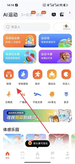 1、打開天天跳繩app,進(jìn)入首頁可看到跳繩、體能健身等運(yùn)動入口,點(diǎn)擊跳繩按鈕,進(jìn)入跳繩運(yùn)動頁面。