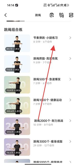 4、權(quán)限開啟后進(jìn)入跳繩組合練頁面,可選擇節(jié)奏彈跳,小腿練習(xí)等課程,點(diǎn)擊進(jìn)入課程詳情頁面,跟隨課程進(jìn)行跳繩運(yùn)動。