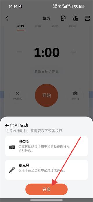 3、在權(quán)限開啟頁面點(diǎn)擊開啟按鈕,允許攝像頭和麥克風(fēng)權(quán)限,以便進(jìn)行AI運(yùn)動識別計(jì)數(shù)。