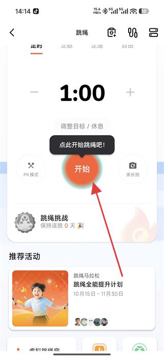 2、在跳繩運(yùn)動頁面,設(shè)置運(yùn)動時(shí)間為1分鐘,點(diǎn)擊開始按鈕,進(jìn)入權(quán)限開啟頁面。