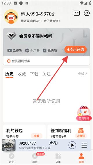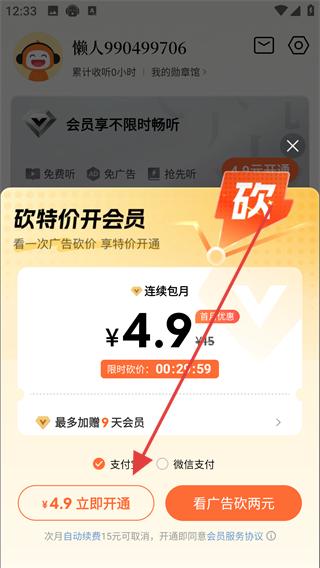 4、確認(rèn)支付方式后點(diǎn)擊4.9立即開通,完成支付,即可開通會(huì)員,享受免貴聽、免廣告、搶先聽等會(huì)員權(quán)益。