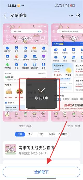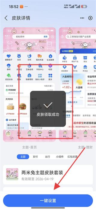 3、領(lǐng)取皮膚后點擊一鍵設(shè)置按鈕,即可將兩米兔主題皮膚應(yīng)用到支付寶界面。
