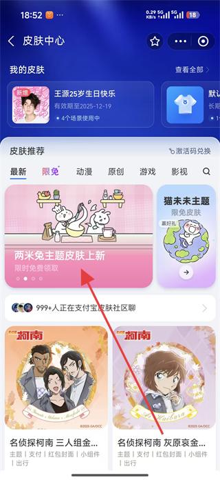1、打開支付寶軟件,進入皮膚中心頁面,在皮膚推薦板塊找到兩米兔主題皮膚上新選項并點擊,進入皮膚詳情頁面。