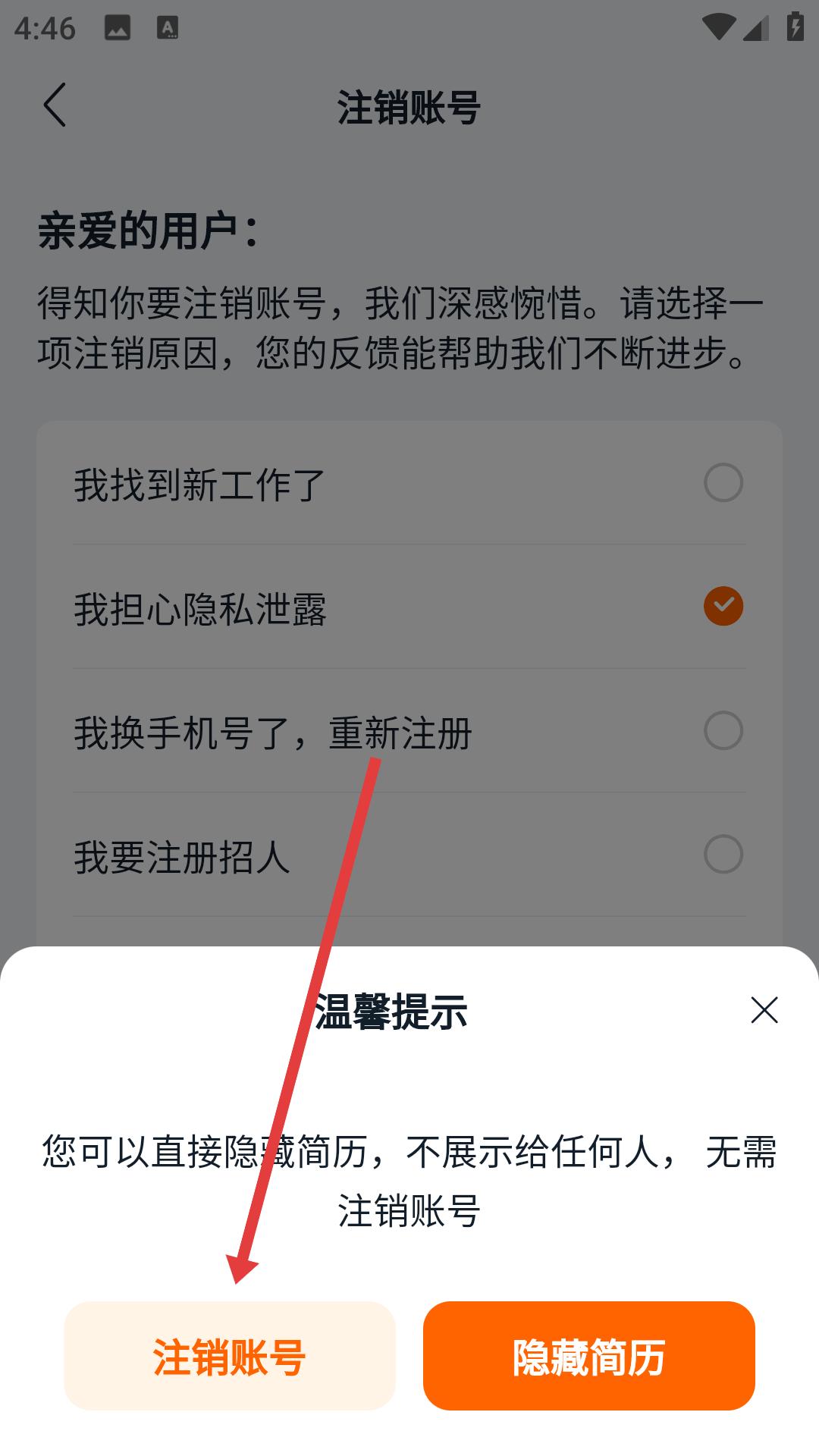 3、點(diǎn)擊后會(huì)彈出溫馨提示提示可通過隱藏簡歷來保護(hù)隱私無需注銷賬號(hào),若仍堅(jiān)持要注銷,點(diǎn)擊注銷賬號(hào)選項(xiàng),進(jìn)入下一步。