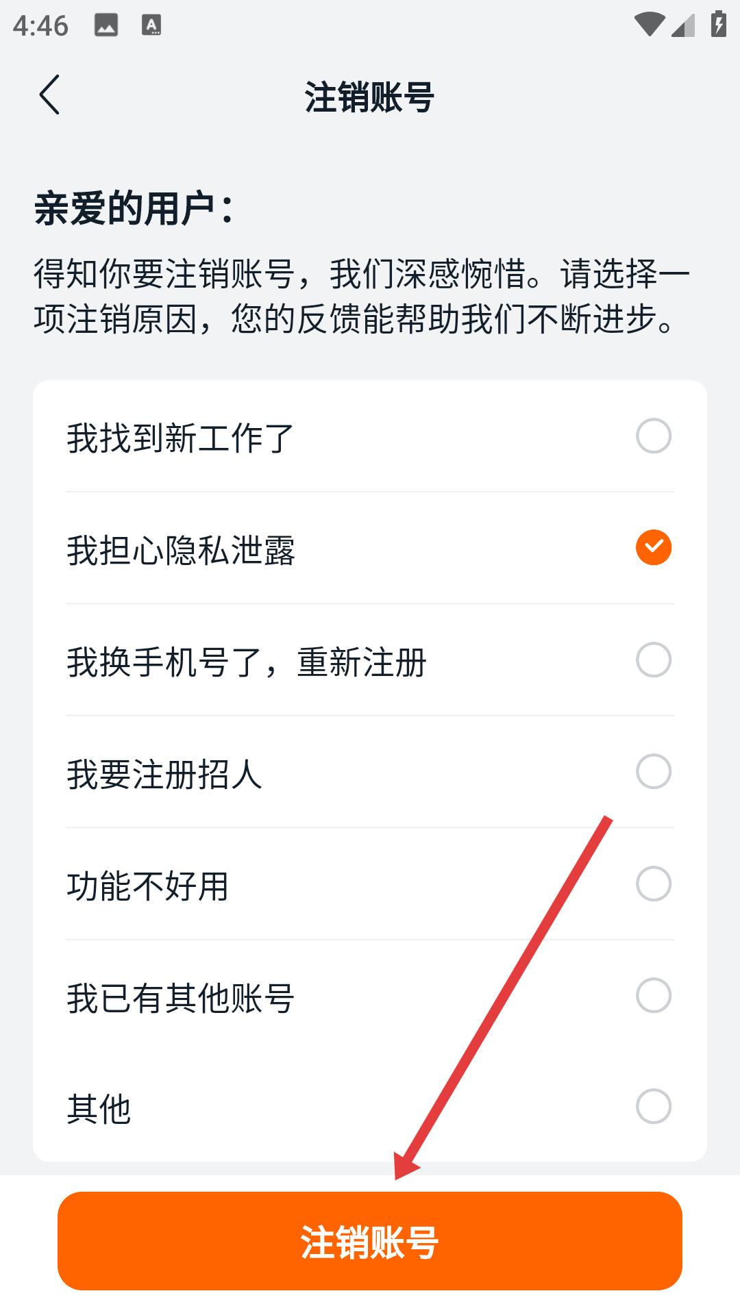 2、進(jìn)入注銷賬號(hào)頁面后在頁面給出的注銷原因里,選擇符合自身情況的一項(xiàng),比如我擔(dān)心隱私泄露,選好后點(diǎn)擊下方的注銷賬號(hào)按鈕。