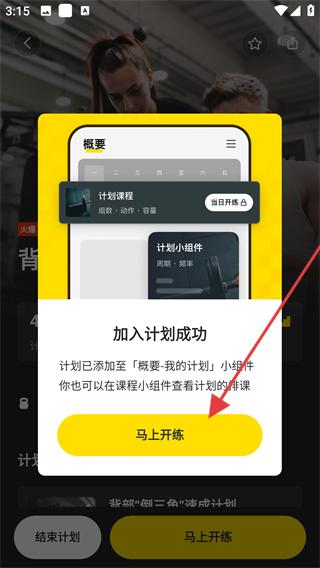 4、加入計劃成功后點擊馬上開練按鈕,即可開始按照計劃進(jìn)行訓(xùn)練,后續(xù)可在課程小組件查看計劃的排課,跟隨計劃提升健身效果。