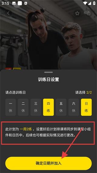3、在訓(xùn)練日設(shè)置頁面選擇訓(xùn)練日期,如周四和周日,點擊確定日期并加入按鈕,完成計劃加入。