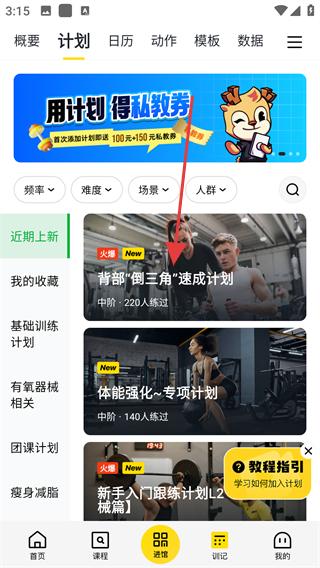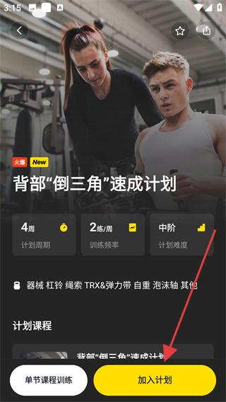 1、進(jìn)入課程頁面可看到近期上新的訓(xùn)練計劃如背部倒三角速成計劃,點擊進(jìn)入該計劃詳情頁面。