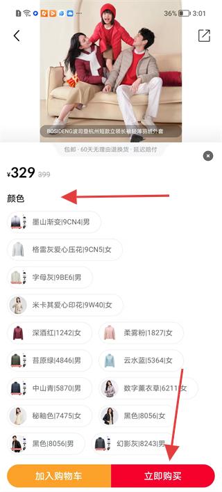 4、在規(guī)格選擇頁面選擇顏色等規(guī)格后,點(diǎn)擊立即購買,完成波司登服飾的購買流程。