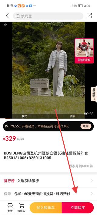 2、在商品列表頁面瀏覽波司登的羽絨服、棉服等商品,查看價(jià)格、銷量等信息,選擇心儀的杭州短款立領(lǐng)長袖輕薄羽絨服進(jìn)入詳情頁。