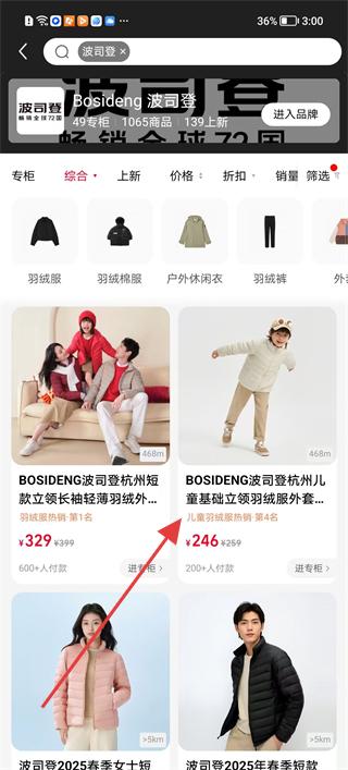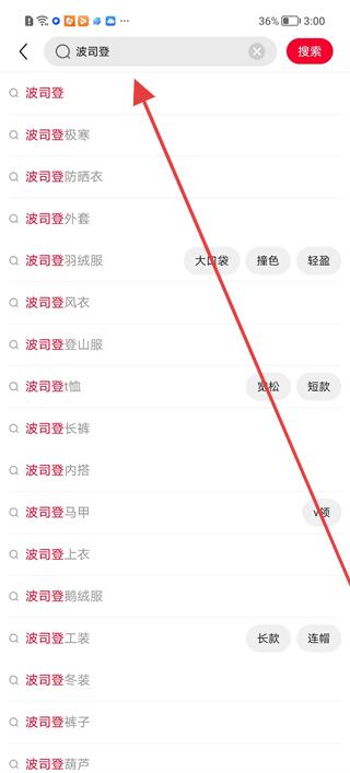1、在搜索頁面在搜索欄輸入波司登,查看相關(guān)搜索建議后,點(diǎn)擊搜索,獲取波司登品牌相關(guān)商品列表。