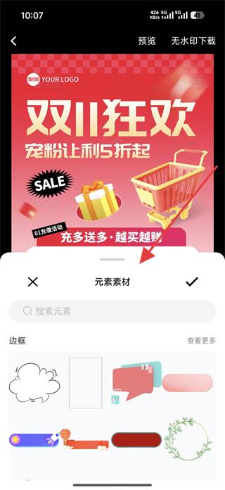 2、在電商里面選擇心儀模板后,進入預覽頁面,可點擊元素素材按鈕,添加邊框、裝飾等元素,豐富模板內容。